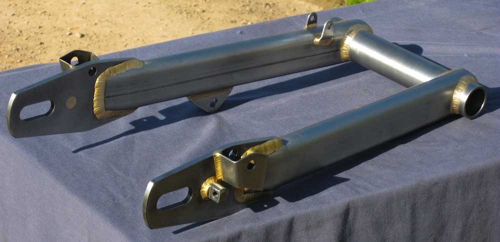 Footrests are of the folding type, with the left one bolted to the lower frame tube, and the right one bolted directly to the gearbox cover. The swing arm has oval section legs and the brake lever is a tubular item. Aluminium side panels and a fibre-glass seat base are available to suit this frame.